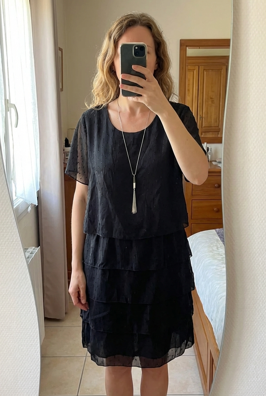 Robe Halogène 42 debout, face à la caméra, dans une chambre à la lumière douce, avec une lumière naturelle filtrant par la fenêtre.