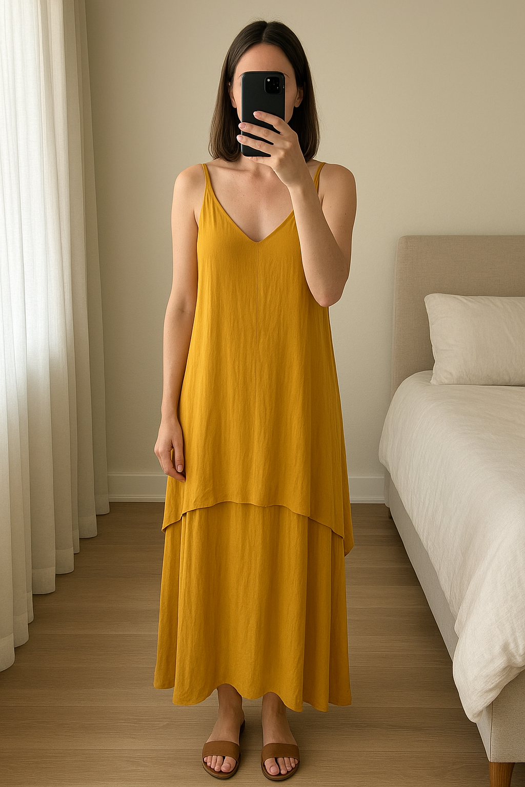 Robe jaune debout, face à la caméra, dans une chambre à la lumière douce, avec une lumière naturelle filtrant par la fenêtre.