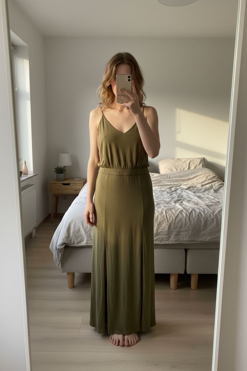 Robe Karma Koma taille S debout, face à la caméra, dans une chambre à la lumière douce, avec une lumière naturelle filtrant par la fenêtre.