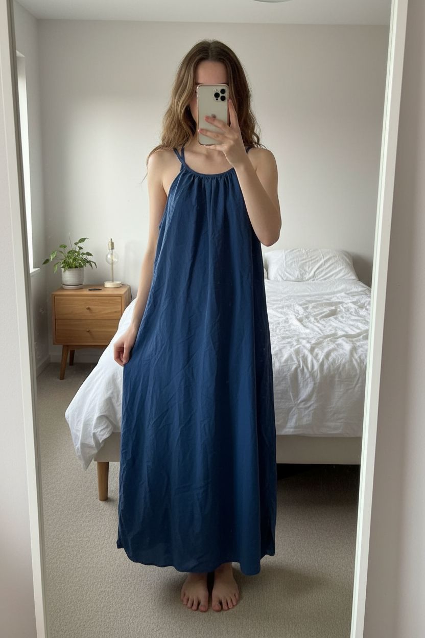 Robe longue Calvin Klein bleu M - Abito lungo Donna m in piedi, rivolto verso la fotocamera, in una camera da letto con luce soffusa e luce naturale che filtra dalla finestra.