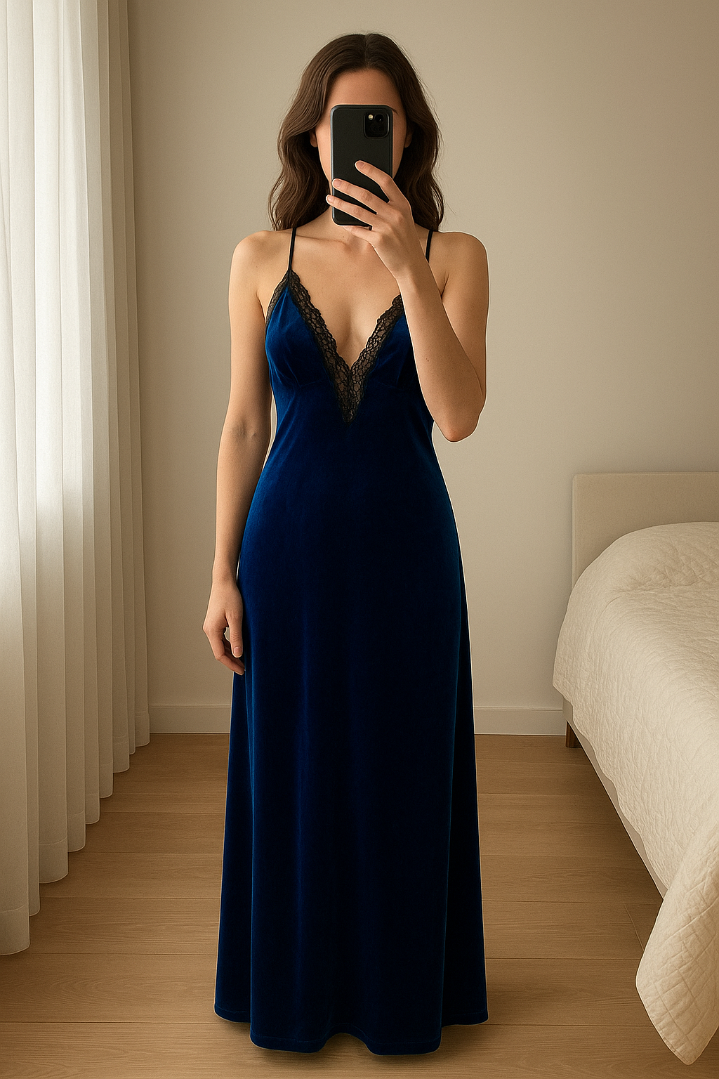 Robe longue femme velours debout, face à la caméra, dans une chambre à la lumière douce, avec une lumière naturelle filtrant par la fenêtre.