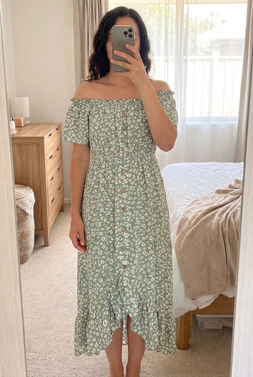 Une personne en Robe longue à fleurs vert sauge - style champêtre romantique debout, face à la caméra, avec une silhouette fine, dans une chambre à la lumière douce, avec une lumière naturelle filtrant par la fenêtre.