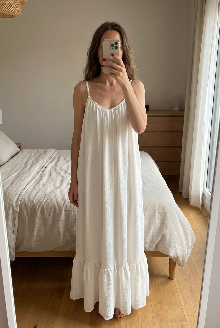 Robe longue Jaspe debout, face à la caméra, dans une chambre à la lumière douce, avec une lumière naturelle filtrant par la fenêtre.