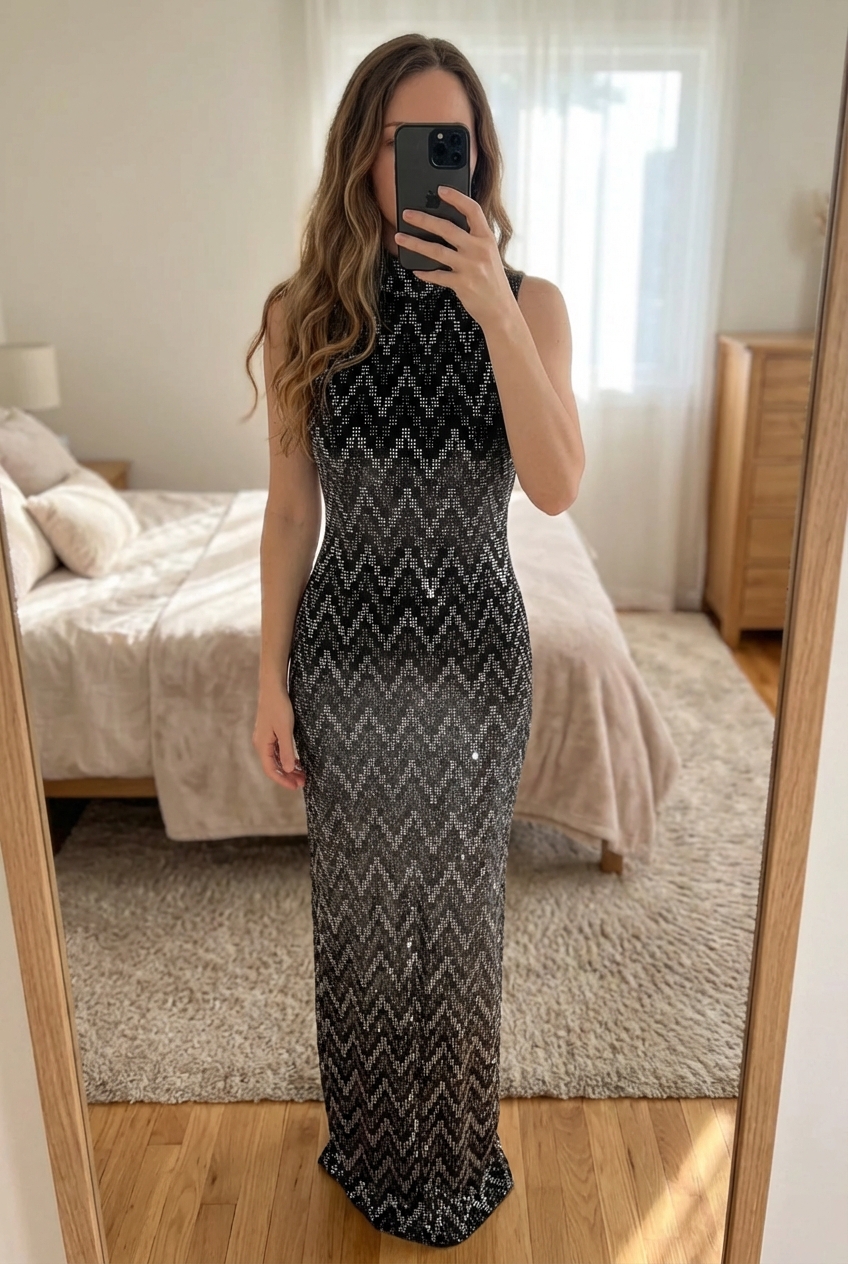 🖤 Robe longue Koton noire à sequins debout, face à la caméra, dans une chambre à la lumière douce, avec une lumière naturelle filtrant par la fenêtre.
