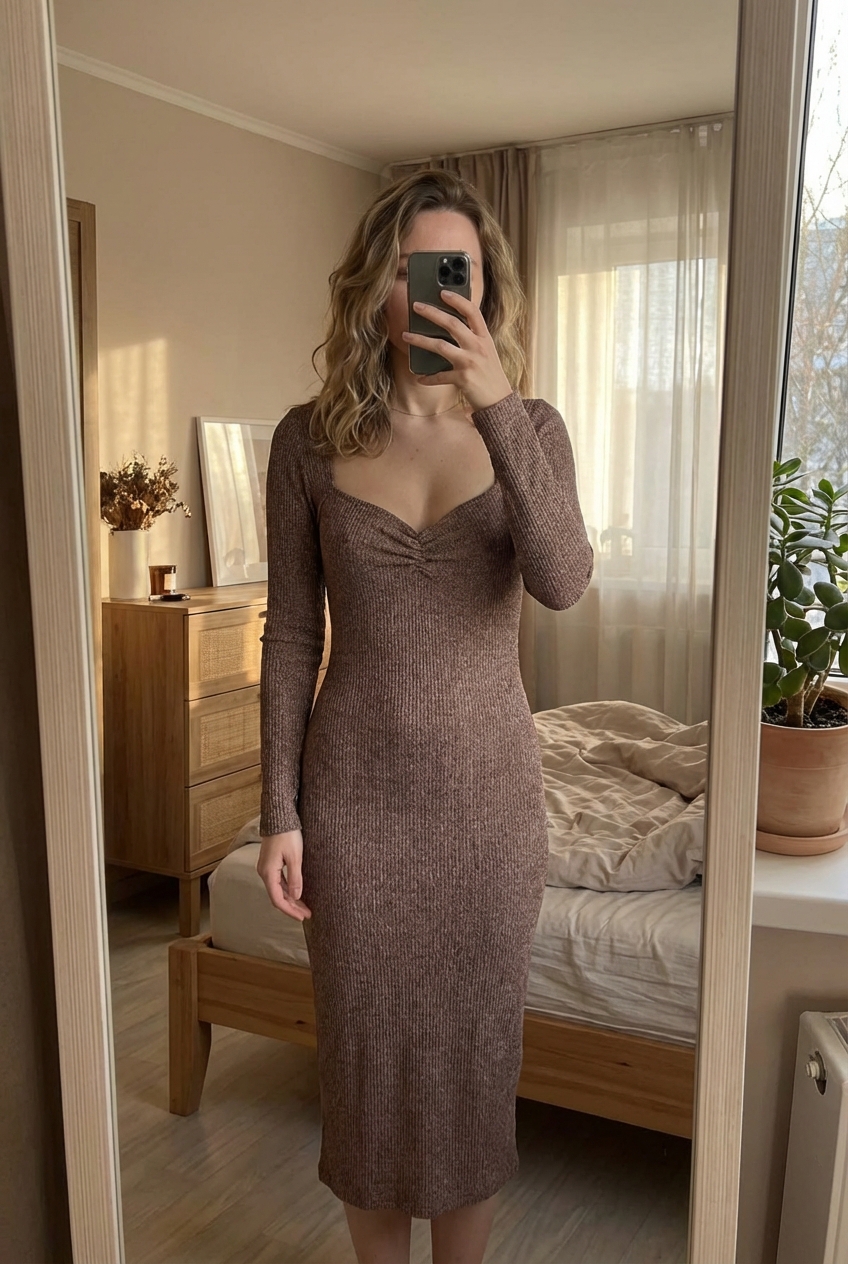 Robe longue Mango Taille XS debout, face à la caméra, dans une chambre à la lumière douce, avec une lumière naturelle filtrant par la fenêtre.