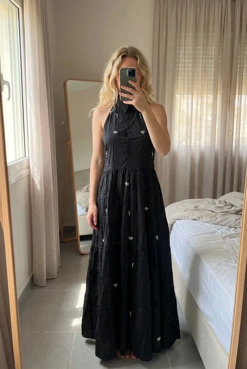 Une personne en Robe longue noire et dos nu brodée de bijoux Lucianda - femme - S - Goa neuve étiquetée 🎀 debout, face à la caméra, dans une chambre à la lumière douce, avec une lumière naturelle filtrant par la fenêtre.