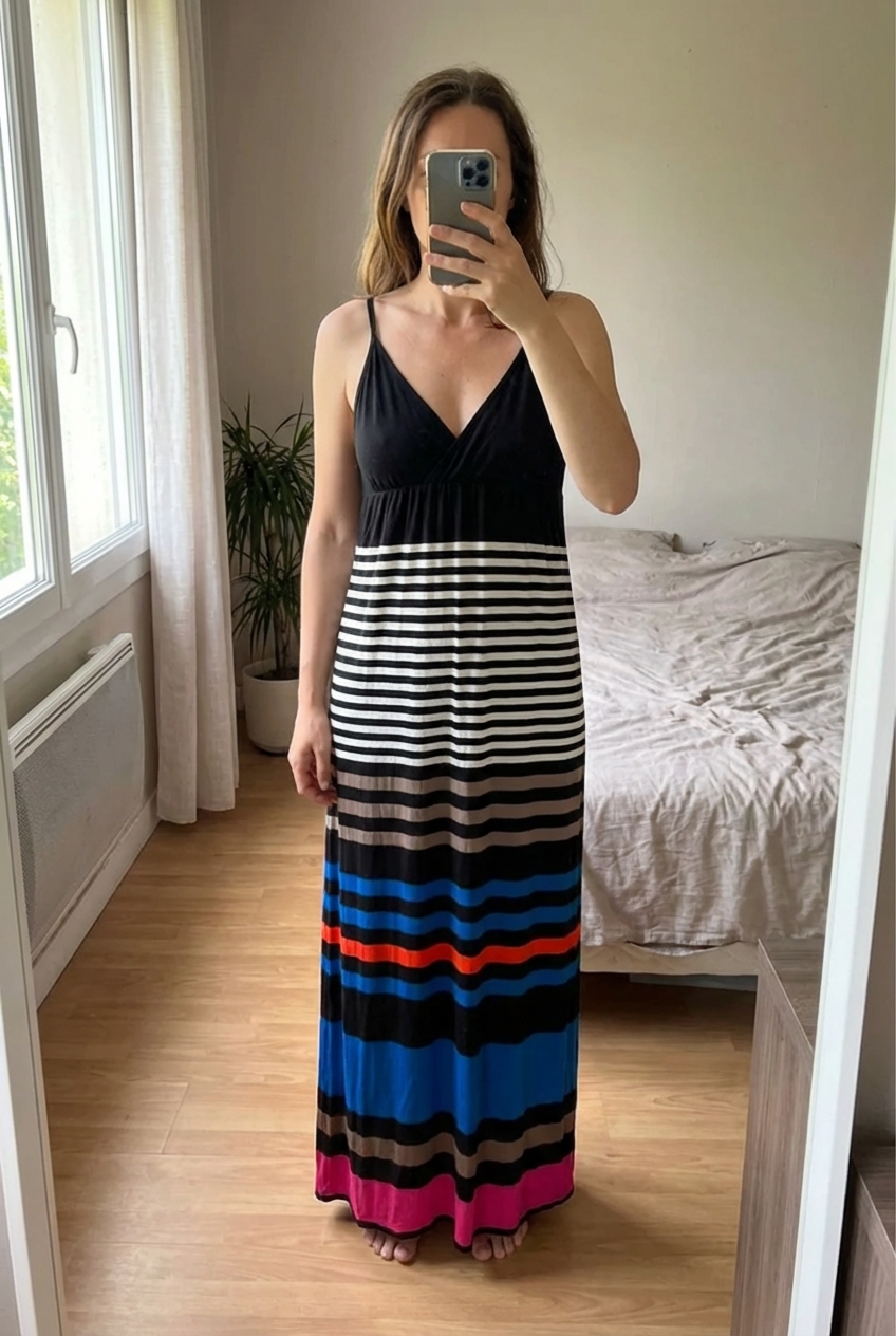 Robe longue à rayures neuve debout, face à la caméra, dans une chambre à la lumière douce, avec une lumière naturelle filtrant par la fenêtre.