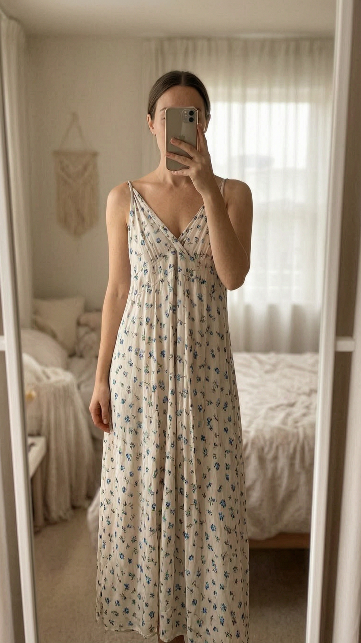 Robe longue été femme Ipanima L XL - Abito lungo donna L in piedi, rivolto verso la fotocamera, in una camera da letto con luce soffusa e luce naturale che filtra dalla finestra.
