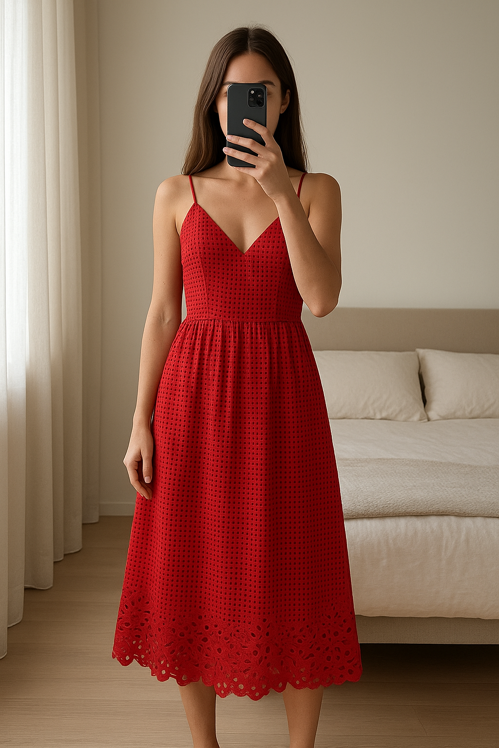 Robe longue tommy hifiger debout, face à la caméra, dans une chambre à la lumière douce, avec une lumière naturelle filtrant par la fenêtre.