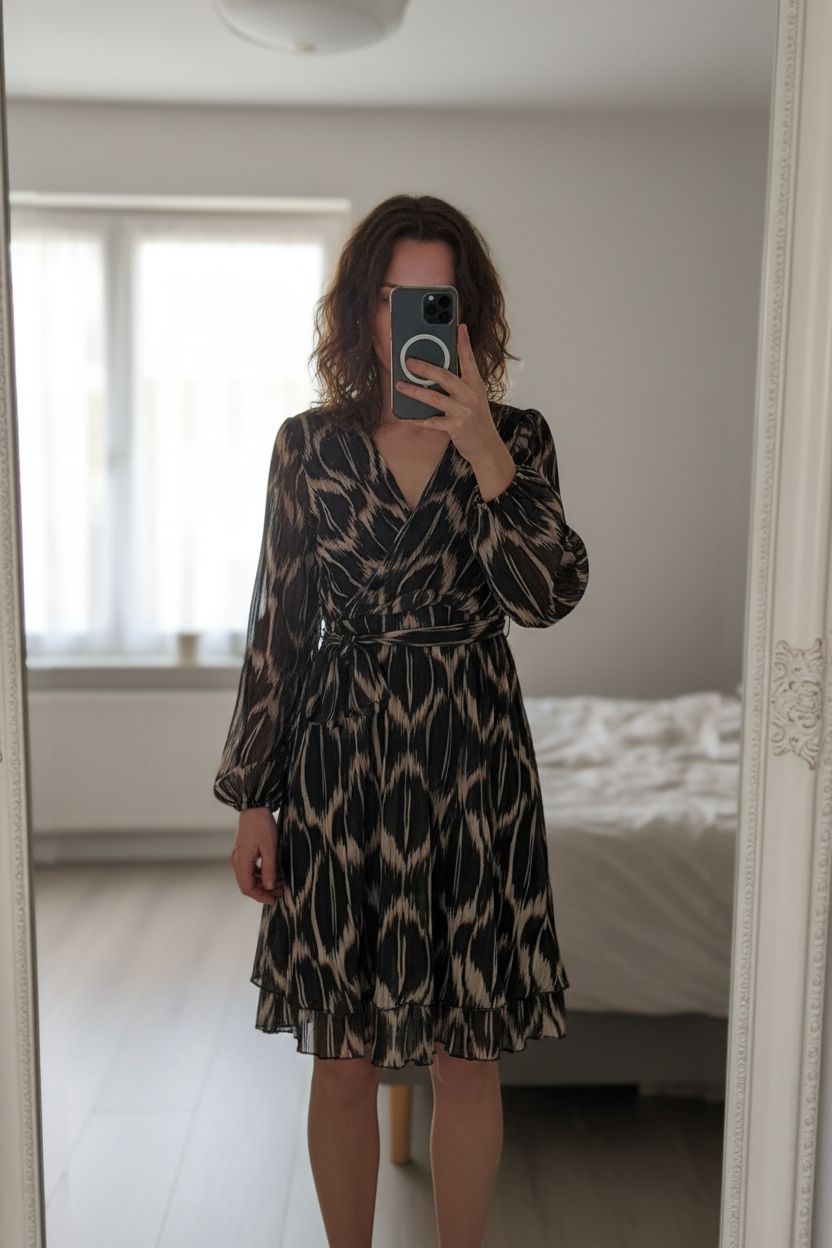 Robe à motifs femme M - Abito Donna M in piedi, rivolto verso la fotocamera, in una camera da letto con luce soffusa e luce naturale che filtra dalla finestra.