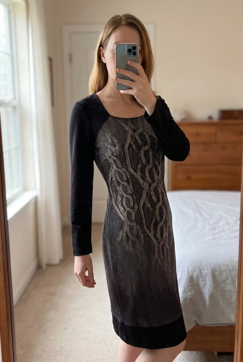 Una persona in Robe à motifs hiver femme M - Abito invernali Donna M inarcando leggermente la schiena per una posa dinamica, in una camera da letto con luce soffusa e luce naturale che filtra dalla finestra.