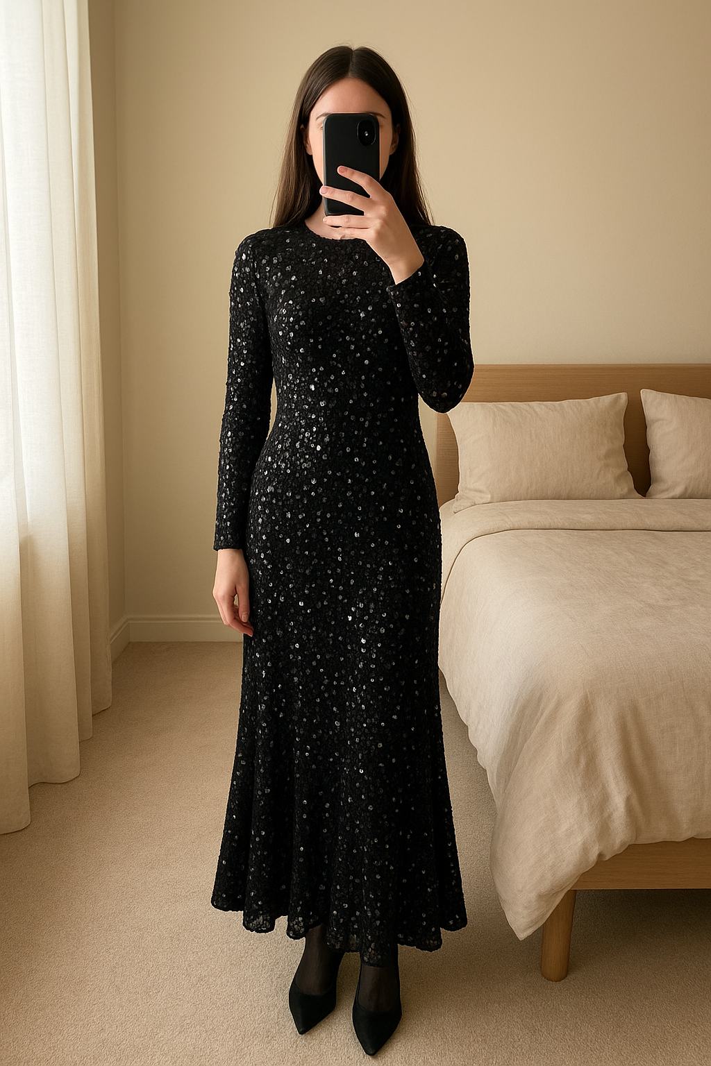Robe noire effet velours à sequin près du corps et évasée debout, face à la caméra, dans une chambre à la lumière douce, avec une lumière naturelle filtrant par la fenêtre.