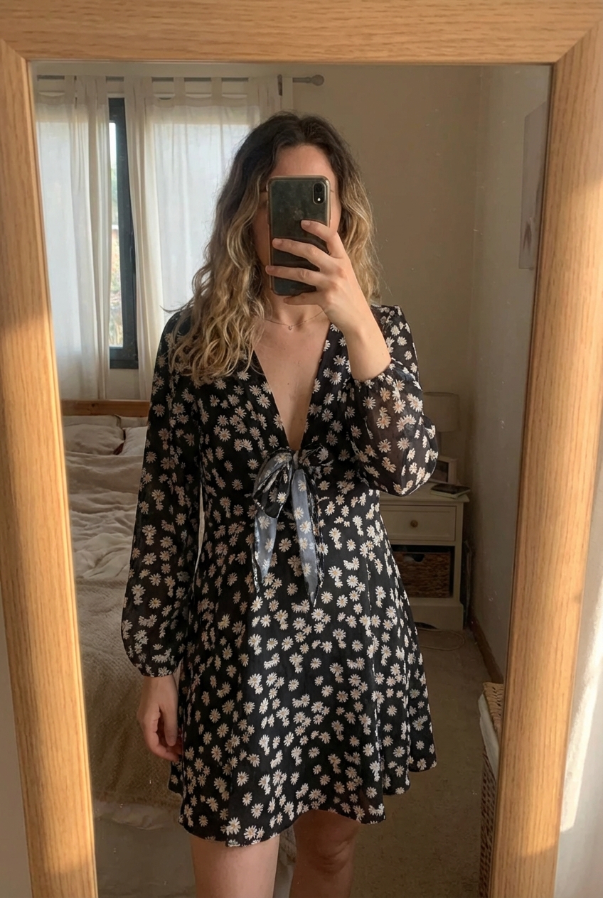 Robe noire fleur blanches s debout, face à la caméra, dans une chambre à la lumière douce, avec une lumière naturelle filtrant par la fenêtre.