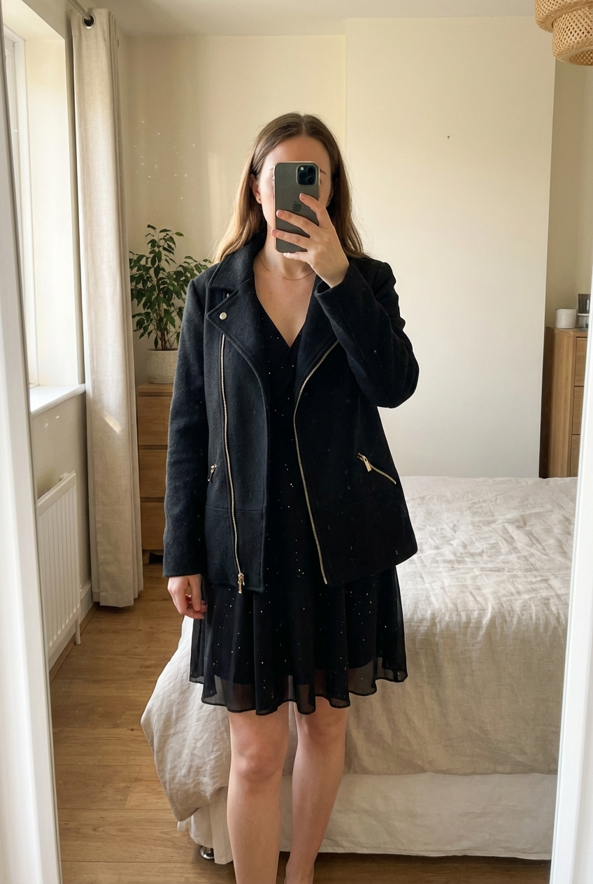 Robe noire Shein finement cloutée XL neuve debout, face à la caméra, dans une chambre à la lumière douce, avec une lumière naturelle filtrant par la fenêtre.