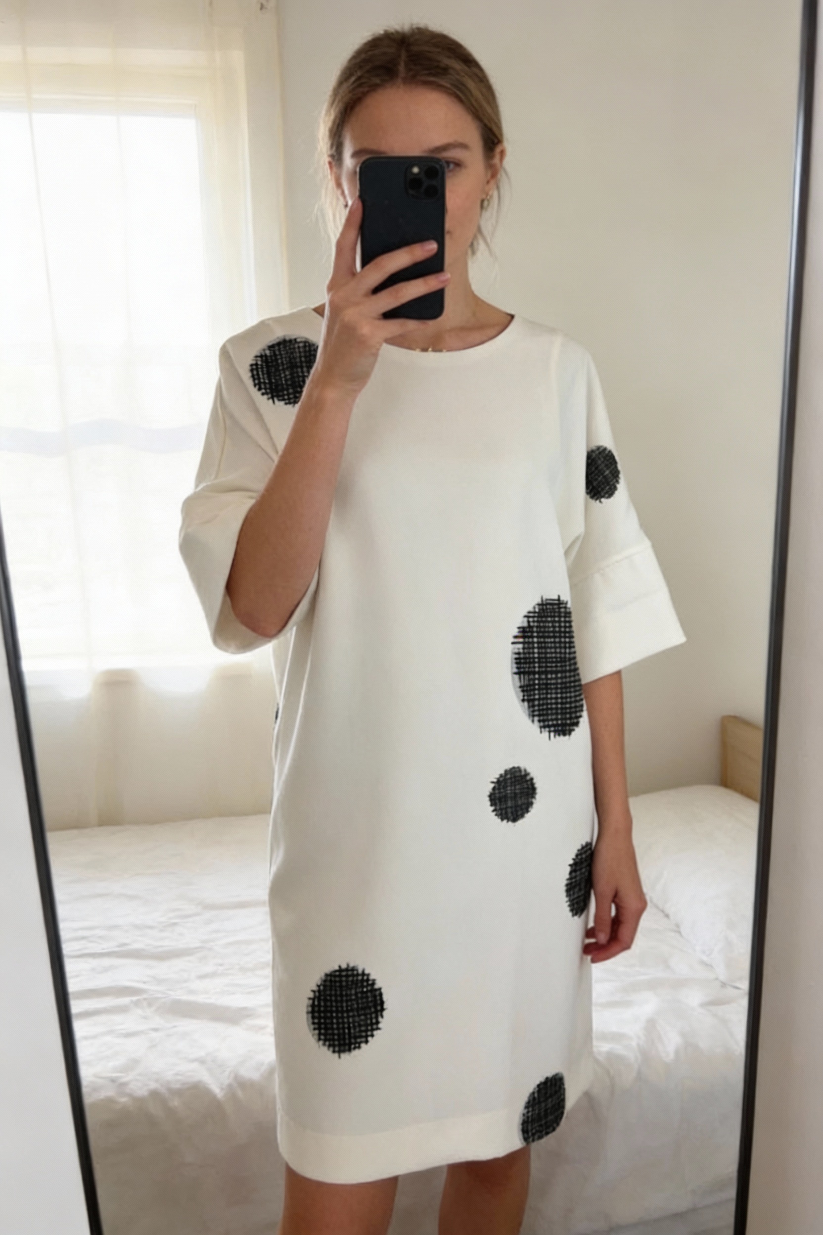 Robe norka debout, face à la caméra, dans une chambre à la lumière douce, avec une lumière naturelle filtrant par la fenêtre.