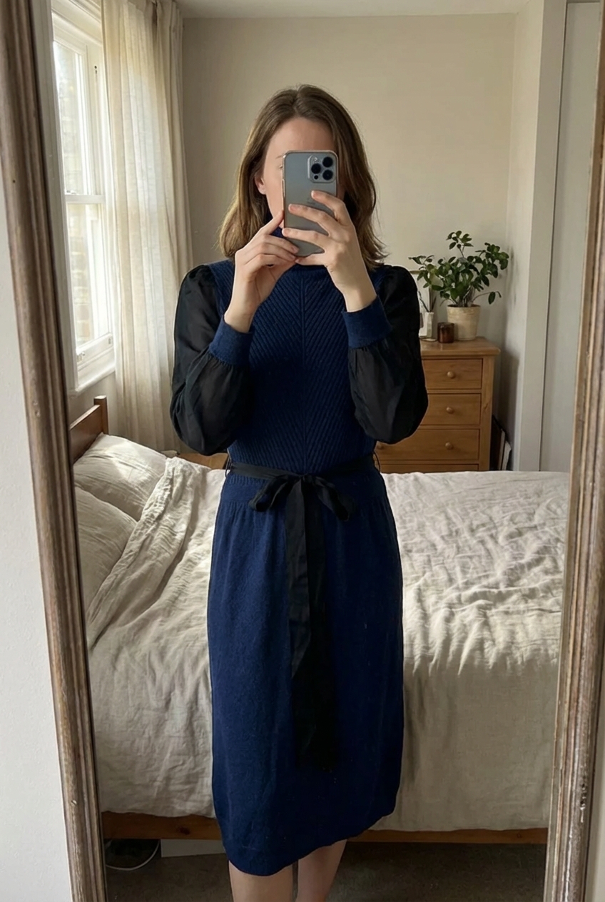 Robe-pull - Hoss Intropia - Laine - Bleu Marine - M debout, face à la caméra, dans une chambre à la lumière douce, avec une lumière naturelle filtrant par la fenêtre.