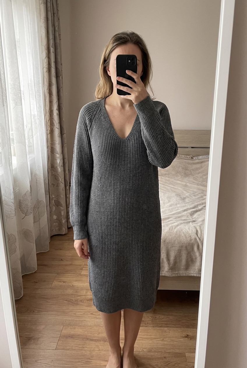 Robe pull mango grise S debout, face à la caméra, dans une chambre à la lumière douce, avec une lumière naturelle filtrant par la fenêtre.