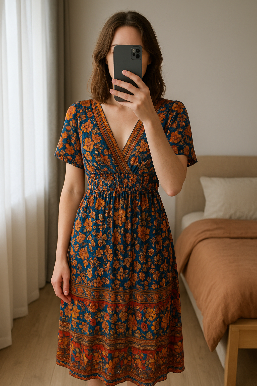 Robe rouge orange bleu debout, face à la caméra, dans une chambre à la lumière douce, avec une lumière naturelle filtrant par la fenêtre.