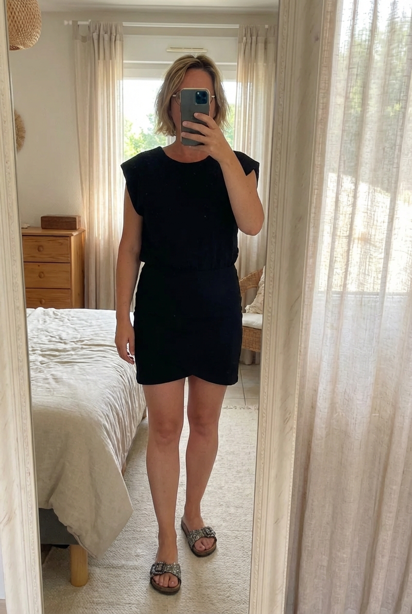 Robe Sézane L debout, face à la caméra, dans une chambre à la lumière douce, avec une lumière naturelle filtrant par la fenêtre.