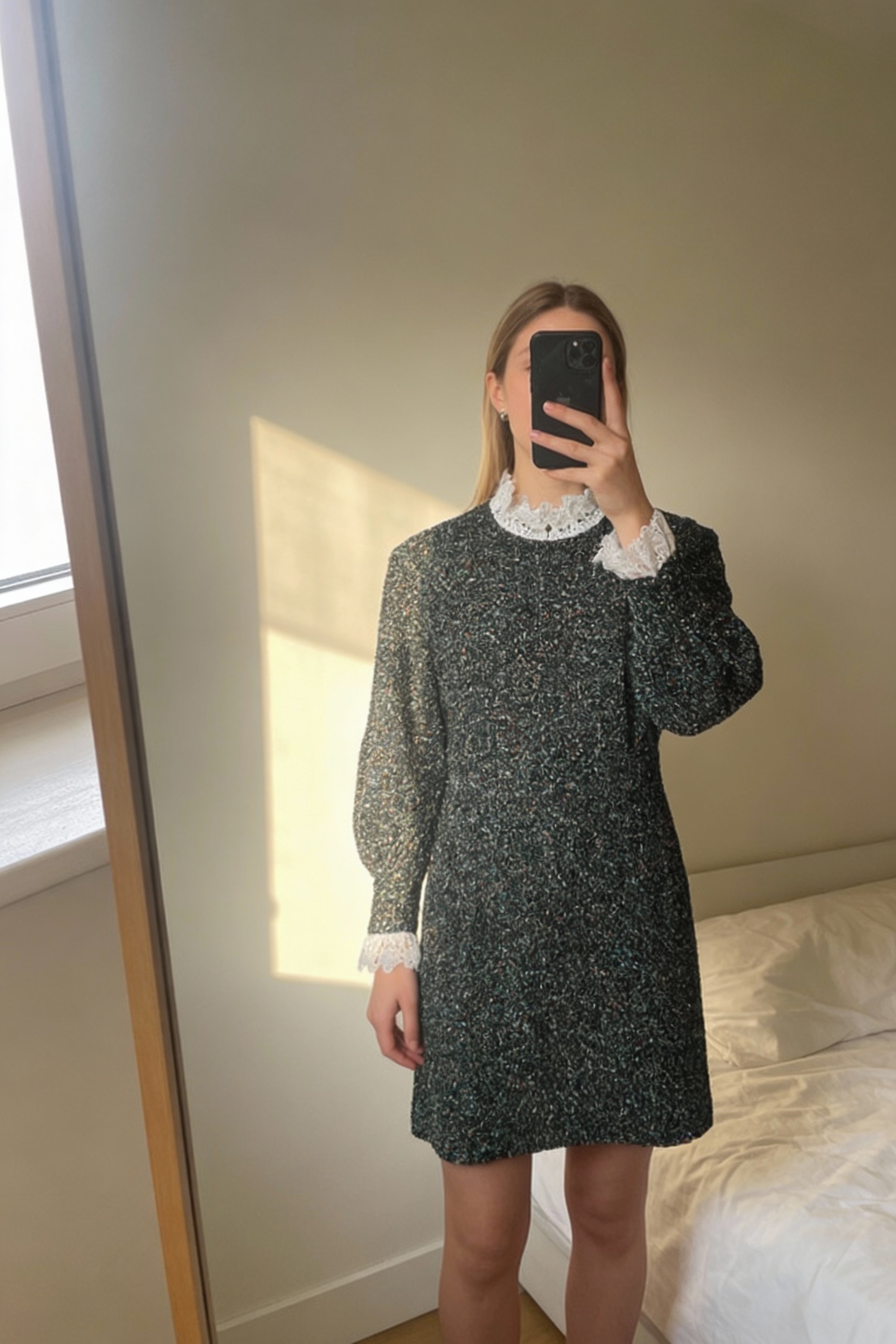 Robe Sandro neuve debout, face à la caméra, dans une chambre à la lumière douce, avec une lumière naturelle filtrant par la fenêtre.