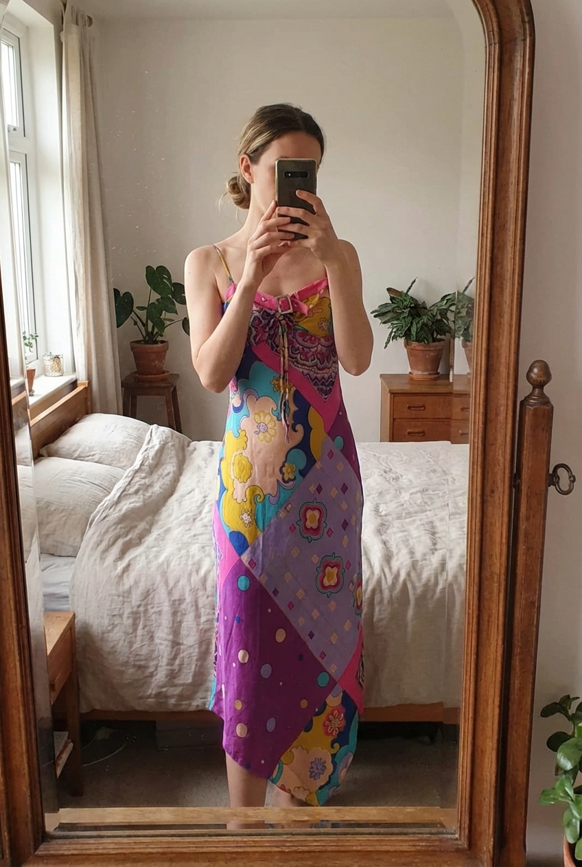 Robe Sandro vintage debout, face à la caméra, dans une chambre à la lumière douce, avec une lumière naturelle filtrant par la fenêtre.
