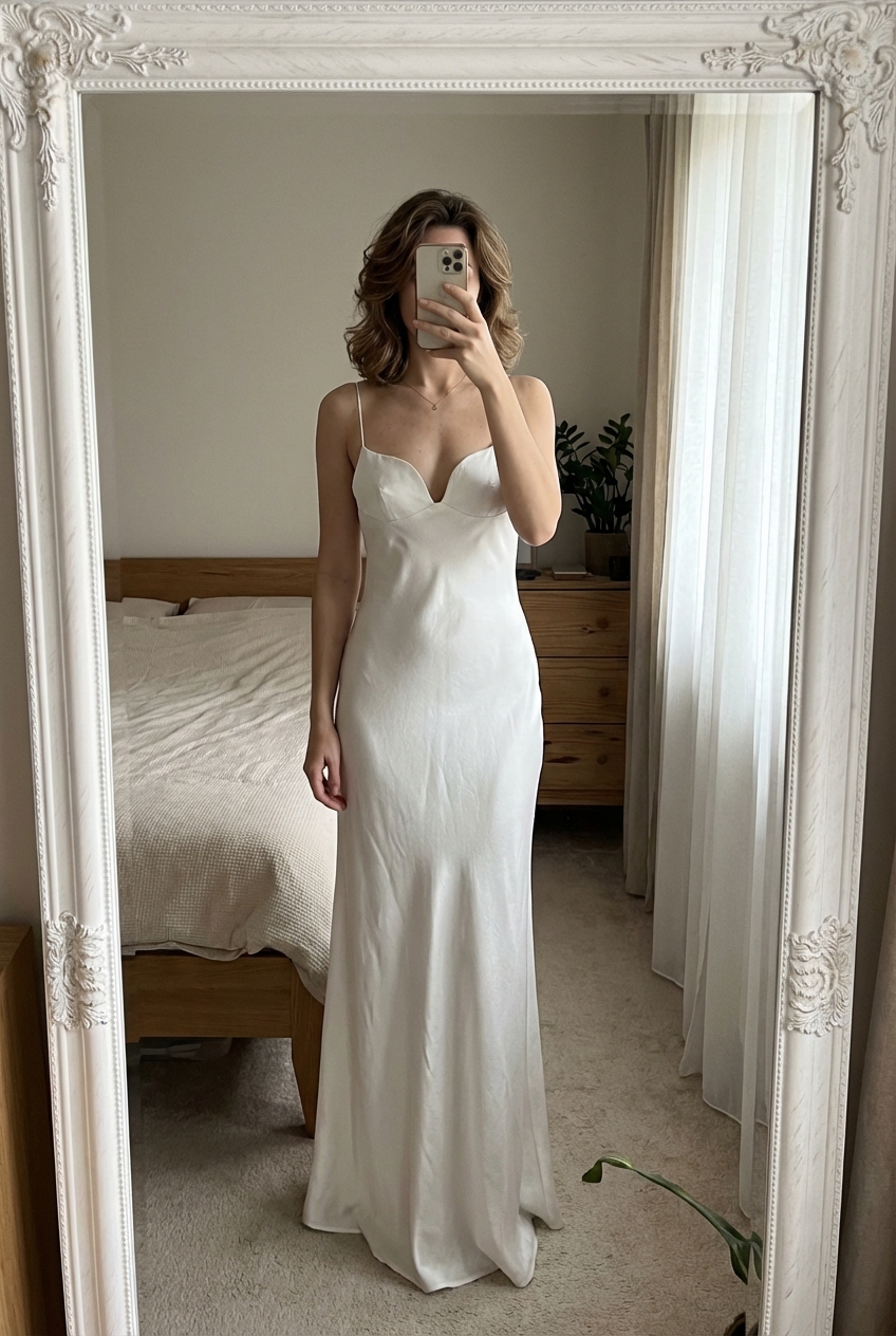 Robe satin longue debout, face à la caméra, dans une chambre à la lumière douce, avec une lumière naturelle filtrant par la fenêtre.
