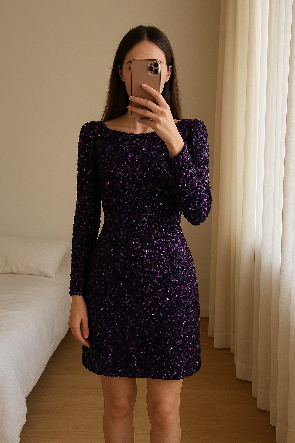 Robe à sequins violet Grass-Fields debout, face à la caméra, dans une chambre à la lumière douce, avec une lumière naturelle filtrant par la fenêtre.