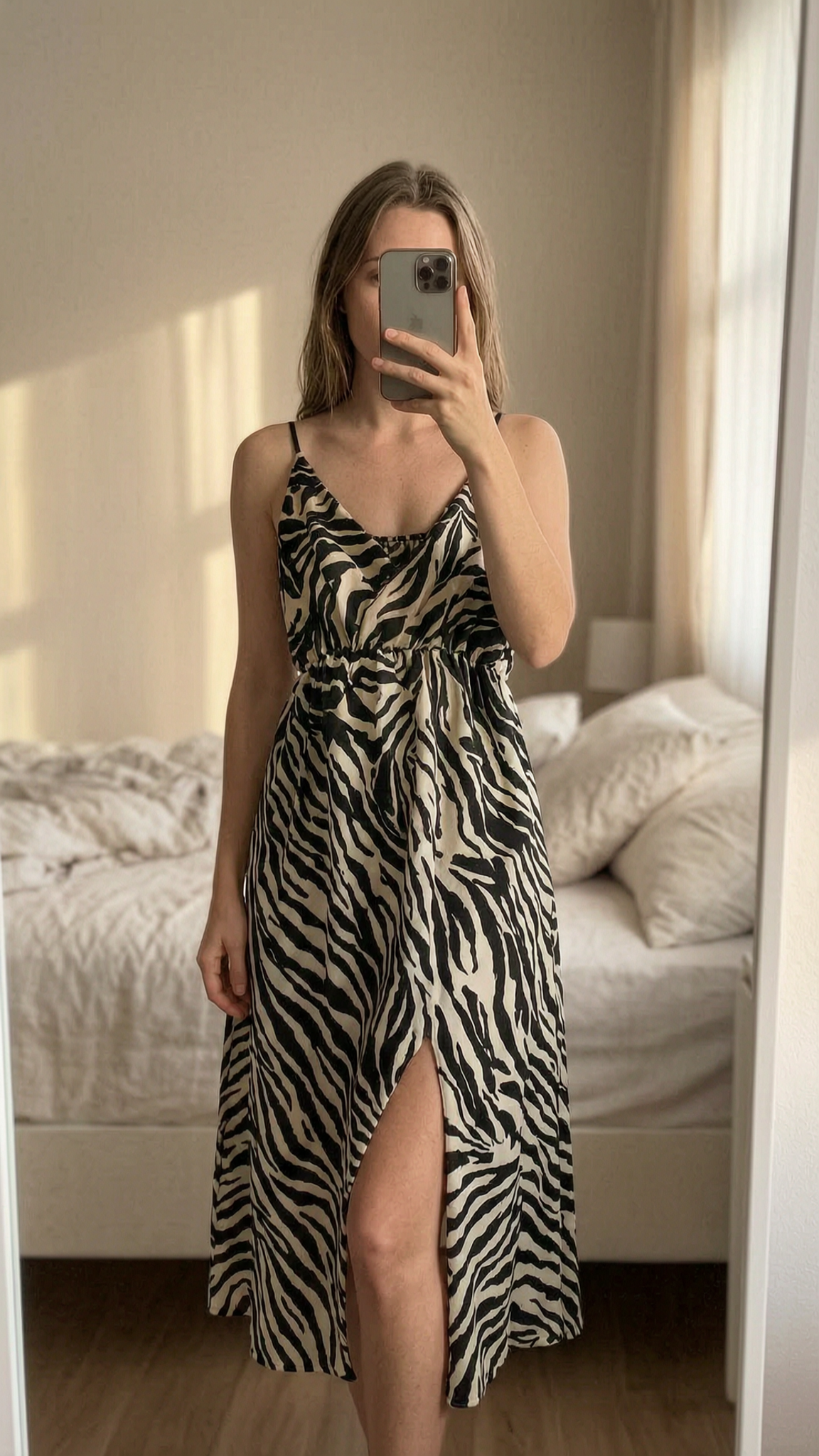 Robe été motifs zèbre S - Abito estivo estate Donna S in piedi, rivolto verso la fotocamera, in una camera da letto con luce soffusa e luce naturale che filtra dalla finestra.