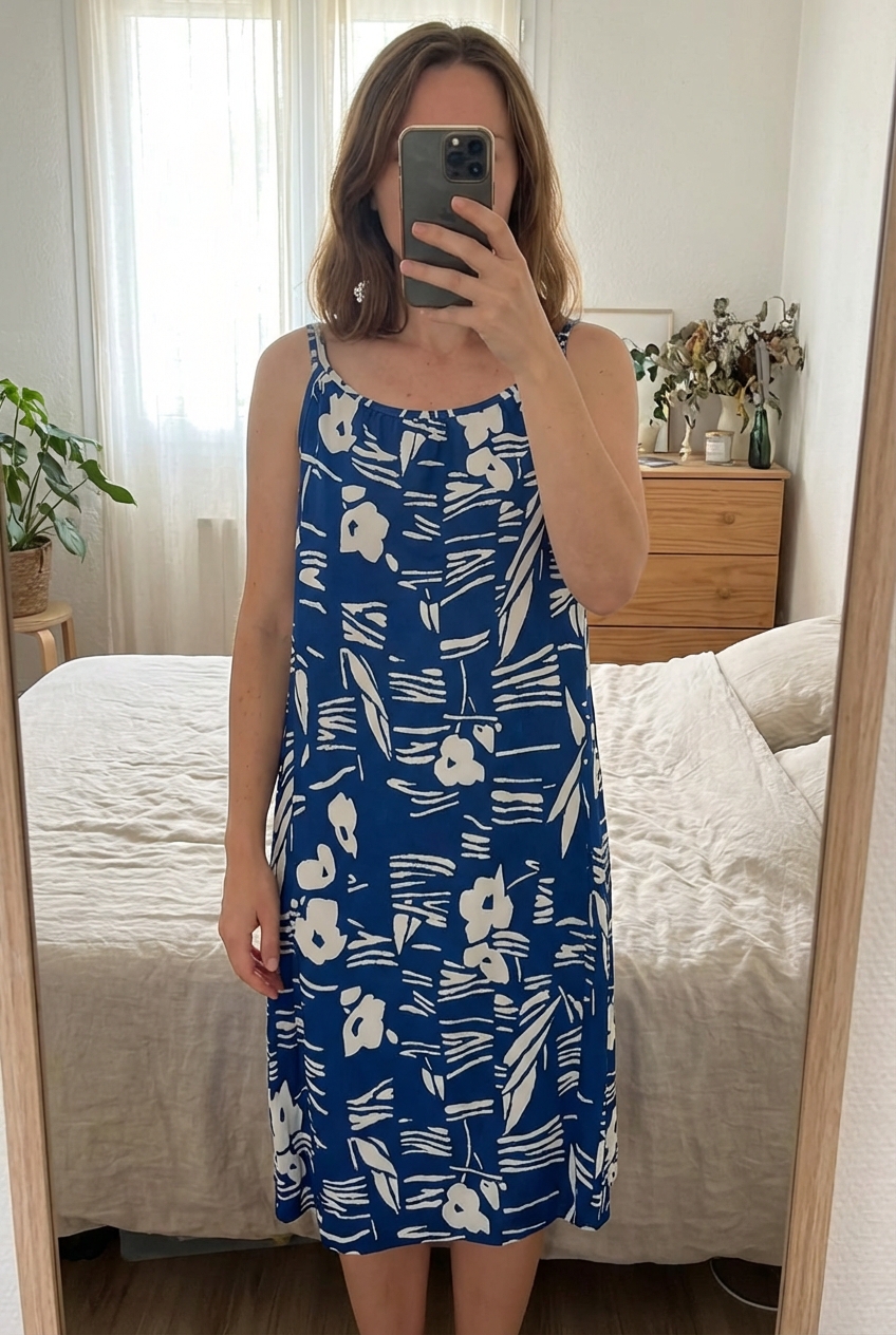 Robe taille s Zara debout, face à la caméra, dans une chambre à la lumière douce, avec une lumière naturelle filtrant par la fenêtre.
