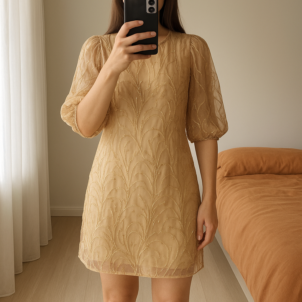 Robe Zara beige neuf debout, face à la caméra, dans une chambre à la lumière douce, avec une lumière naturelle filtrant par la fenêtre.