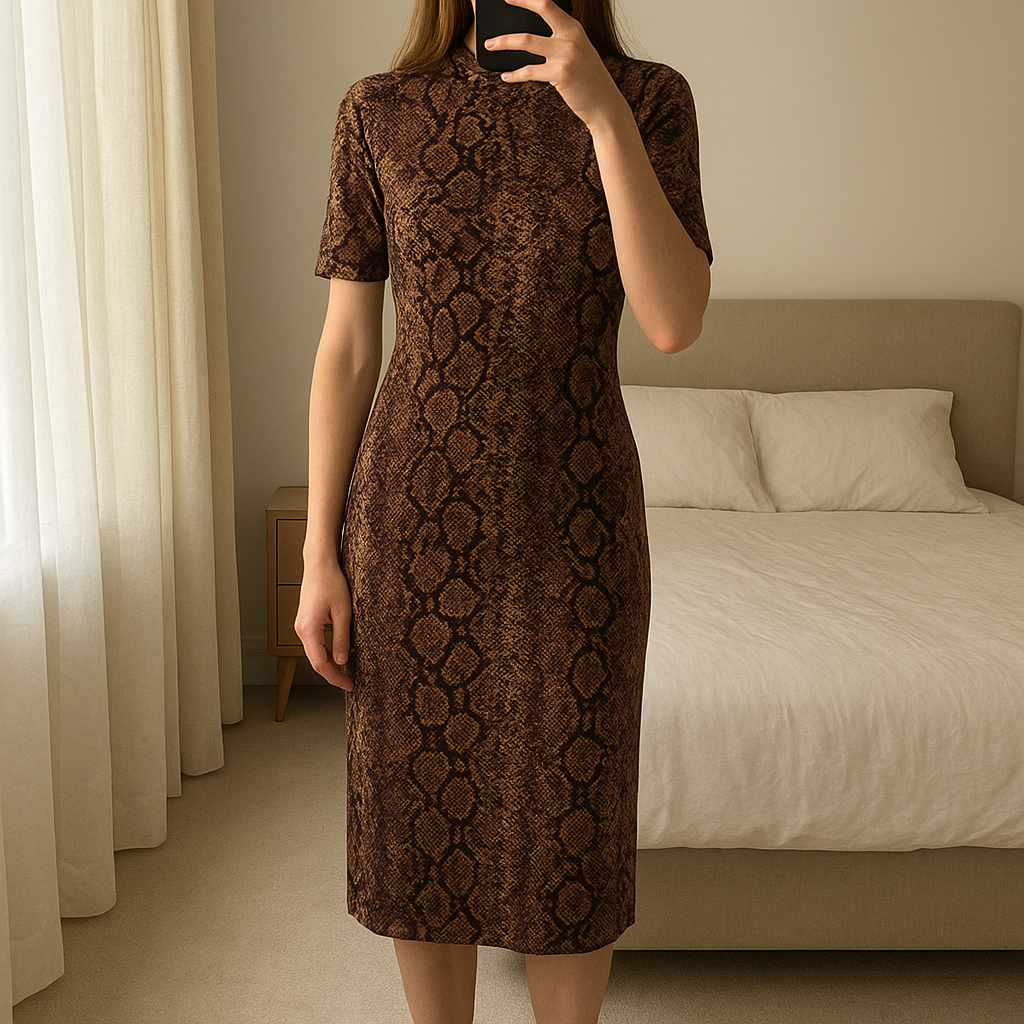 Une personne en Robe Zara imprimé serpent Taille S debout, face à la caméra, dans une chambre à la lumière douce, avec une lumière naturelle filtrant par la fenêtre.