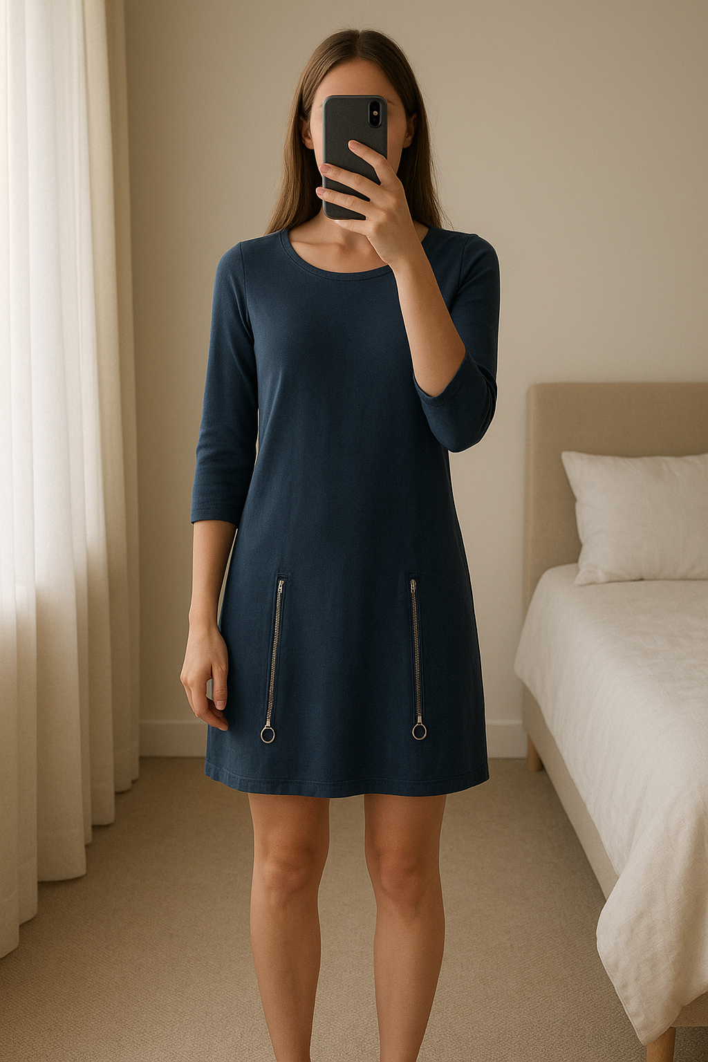 Robes debout, face à la caméra, dans une chambre à la lumière douce, avec une lumière naturelle filtrant par la fenêtre.