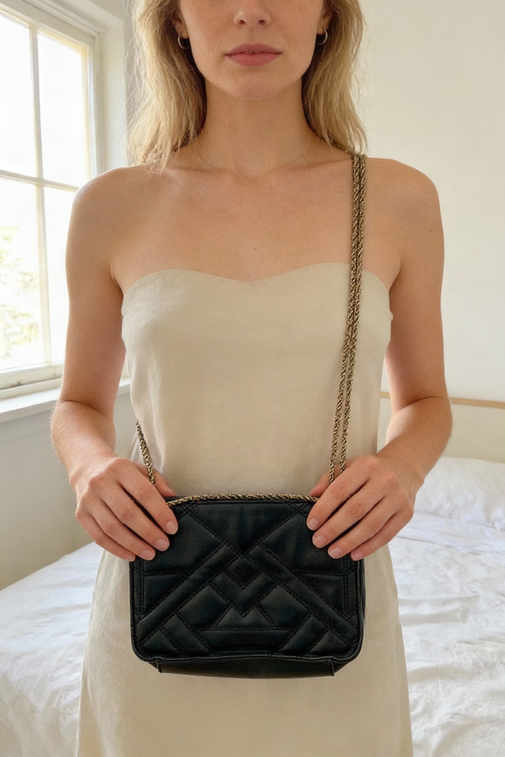 Sac a main en cuir mini belli matelassé sezane debout, face à la caméra, dans une chambre à la lumière douce, avec une lumière naturelle filtrant par la fenêtre.