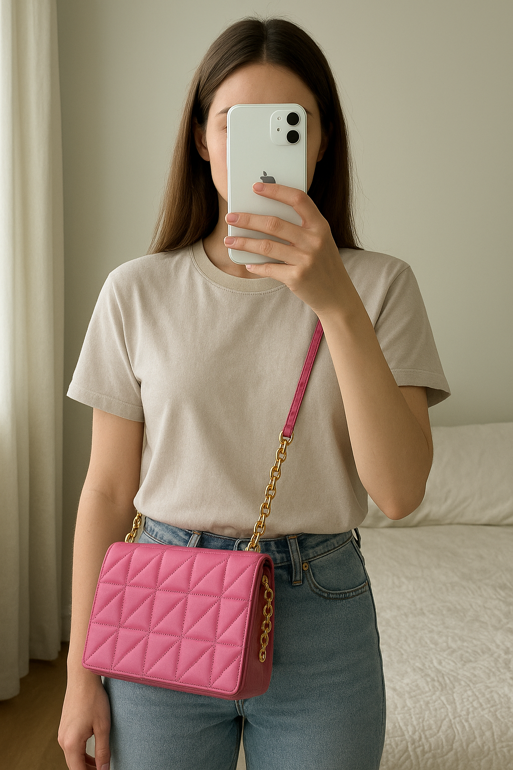 Sac à mains shein couleur 🩷 debout, face à la caméra, dans une chambre à la lumière douce, avec une lumière naturelle filtrant par la fenêtre.