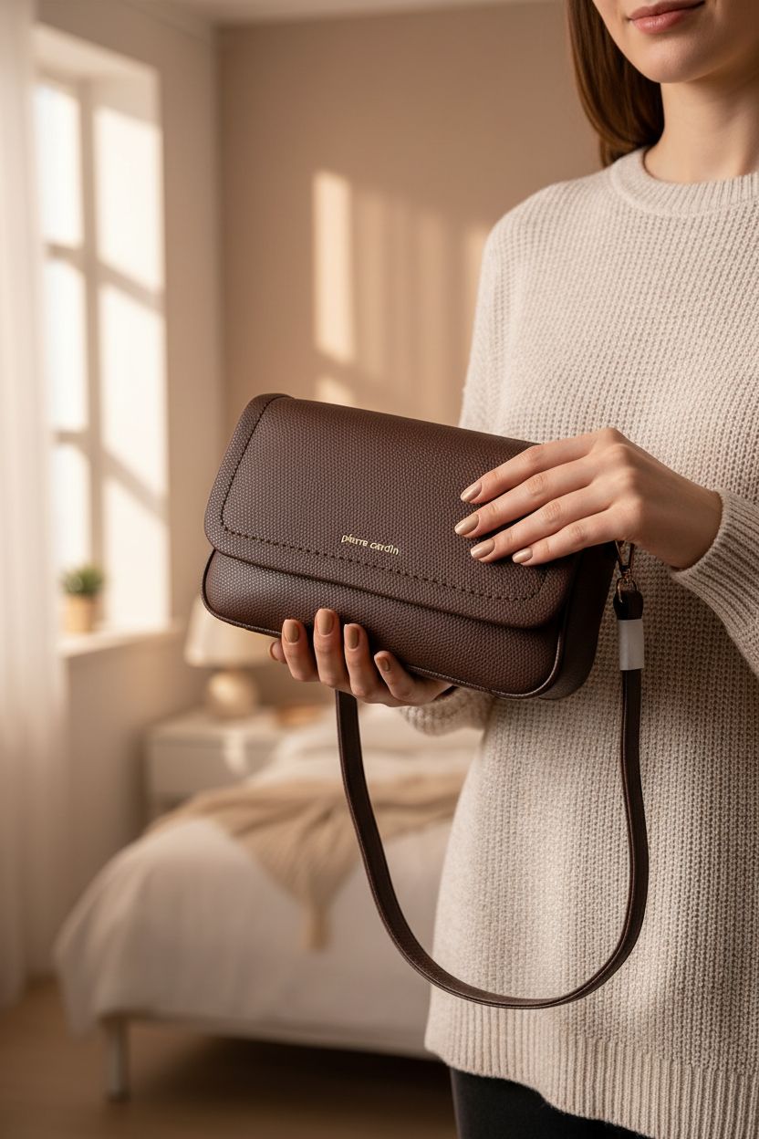 Sac Pierre Cardin marron grainé – neuf avec étiquette – chic & élégant debout, face à la caméra, dans une chambre à la lumière douce, avec une lumière naturelle filtrant par la fenêtre.