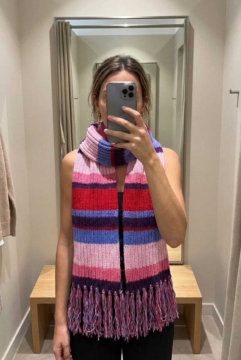 Una persona in Sciarpa a righe multicolor con frange in piedi, rivolto verso la fotocamera, in un camerino in stile boutique con specchio e decorazioni neutre.