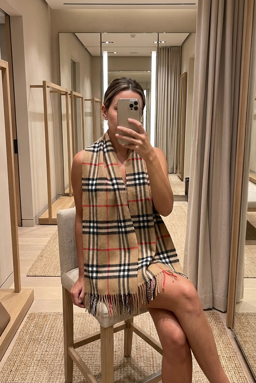 Una persona in Sciarpa con Motivo Check Classico seduto su una sedia alta, con postura rilassata, in un camerino in stile boutique con specchio e decorazioni neutre.