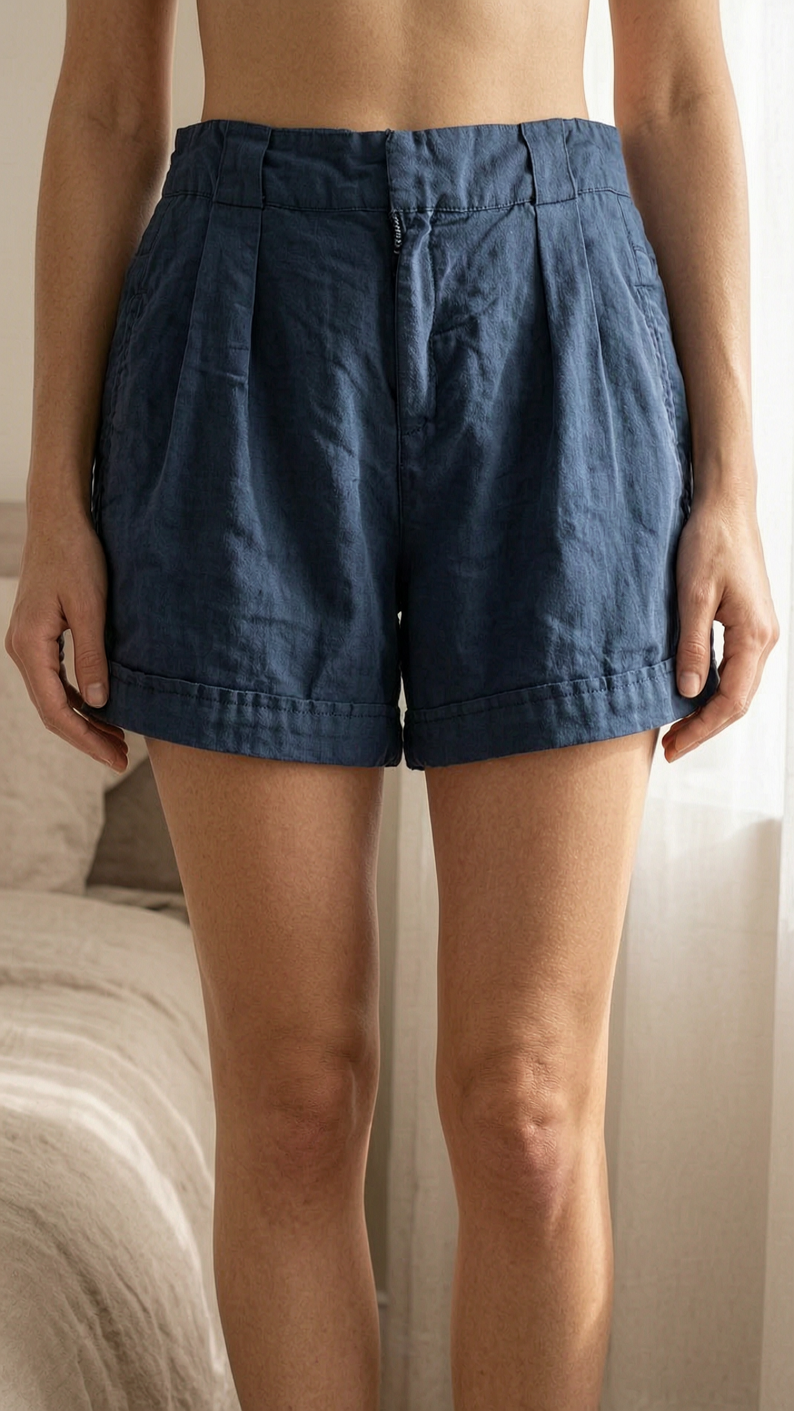 Short fluide été M stradivarius - pantaloncini estate in piedi, rivolto verso la fotocamera, in una camera da letto con luce soffusa e luce naturale che filtra dalla finestra.