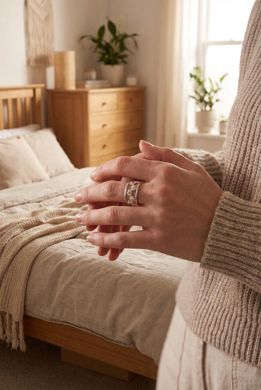 Silver daisy ring standing straight facing the camera, in a softly lit bedroom setting, with gentle natural light filtering through a window.