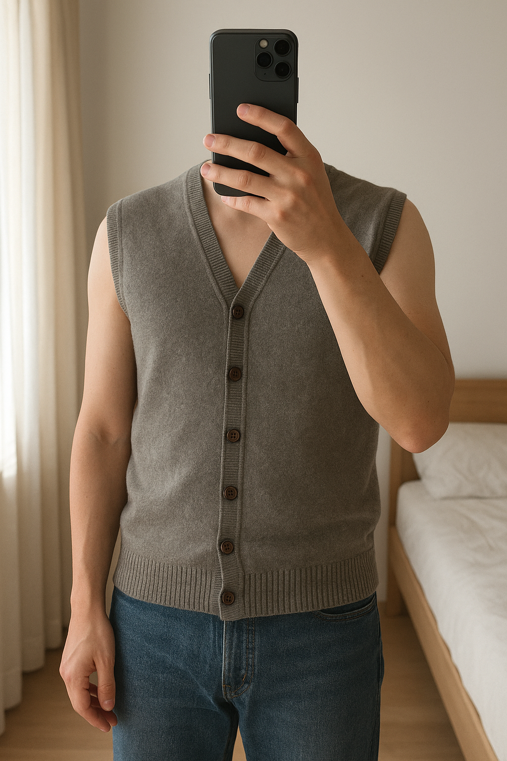 Smanicato North Pole in piedi, rivolto verso la fotocamera, in una camera da letto con luce soffusa e luce naturale che filtra dalla finestra.