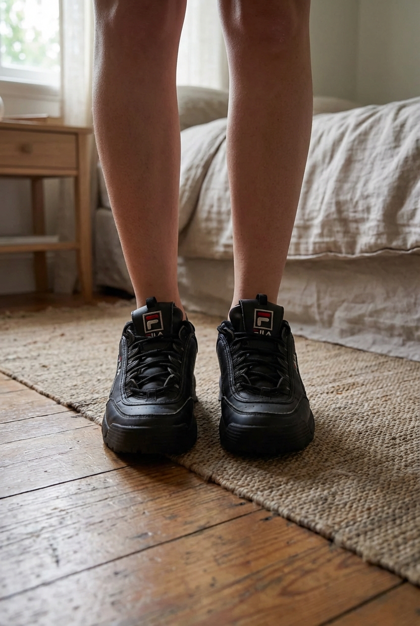 Sneackers Fila nere n.40 -pelle-distruptor chunky -condizioni eccellenti in piedi, rivolto verso la fotocamera, in una camera da letto con luce soffusa e luce naturale che filtra dalla finestra.