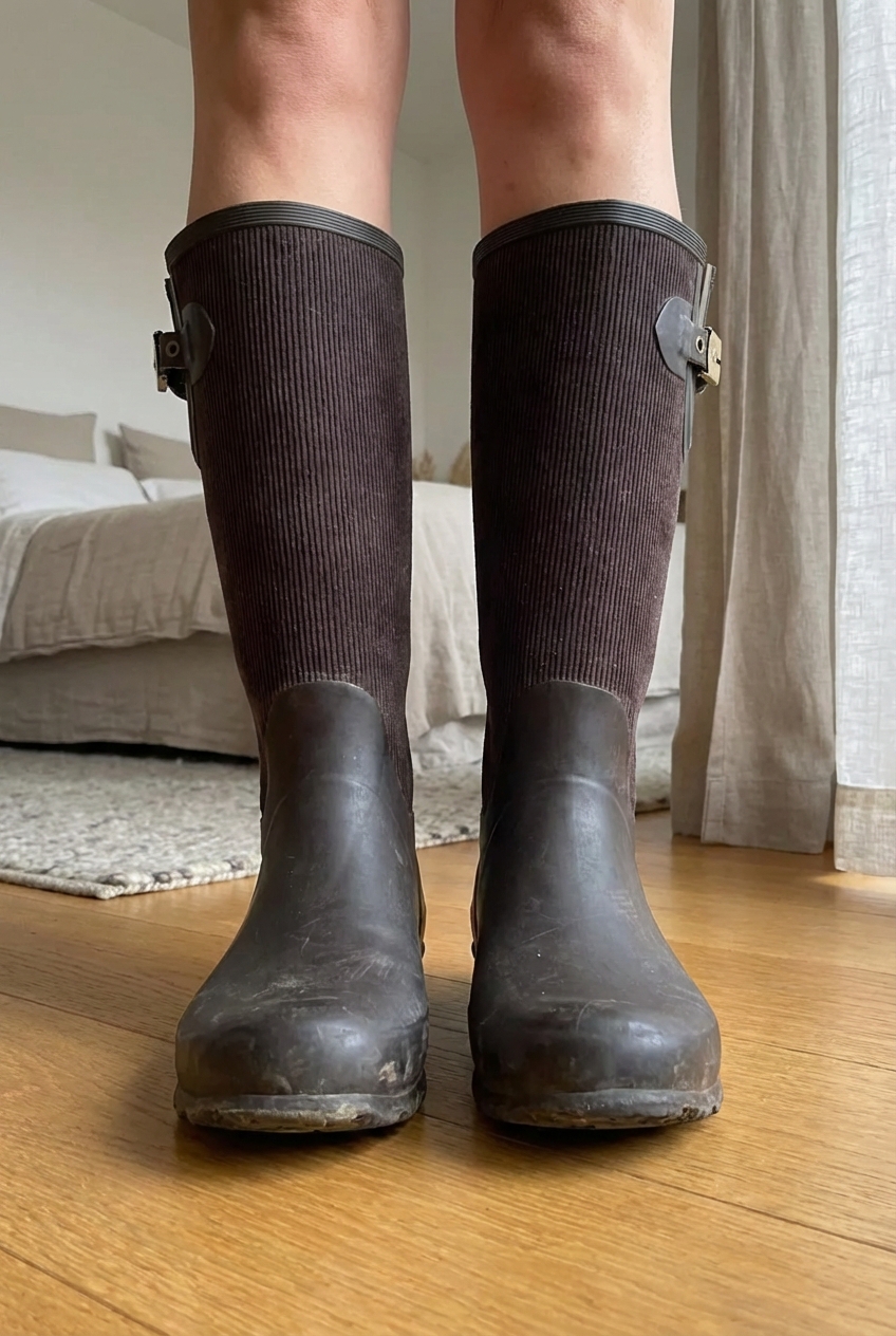 Stivali in gomma - "Scholl" Taglia 39 in piedi, rivolto verso la fotocamera, in una camera da letto con luce soffusa e luce naturale che filtra dalla finestra.