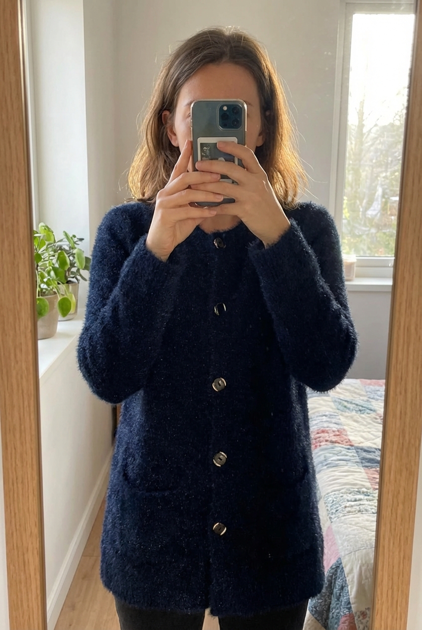 Superbe gilet long Cantaranaña en maille douce et duveteuse noir marine, confortable et féminin ! debout, face à la caméra, dans une chambre à la lumière douce, avec une lumière naturelle filtrant par la fenêtre.