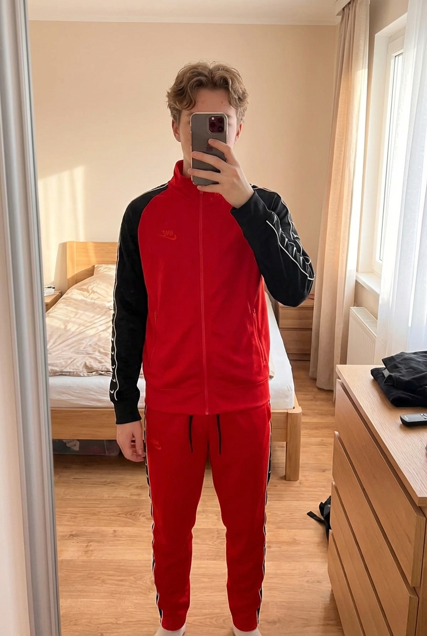 Survêtement Nike rouge et noir debout, face à la caméra, dans une chambre à la lumière douce, avec une lumière naturelle filtrant par la fenêtre.