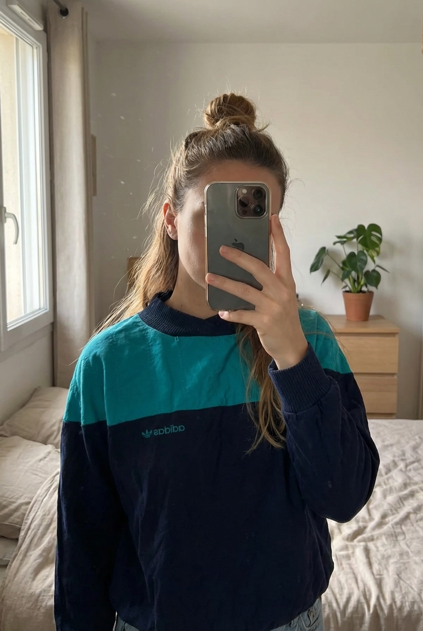 Sweat Adidas Vintage debout, face à la caméra, dans une chambre à la lumière douce, avec une lumière naturelle filtrant par la fenêtre.