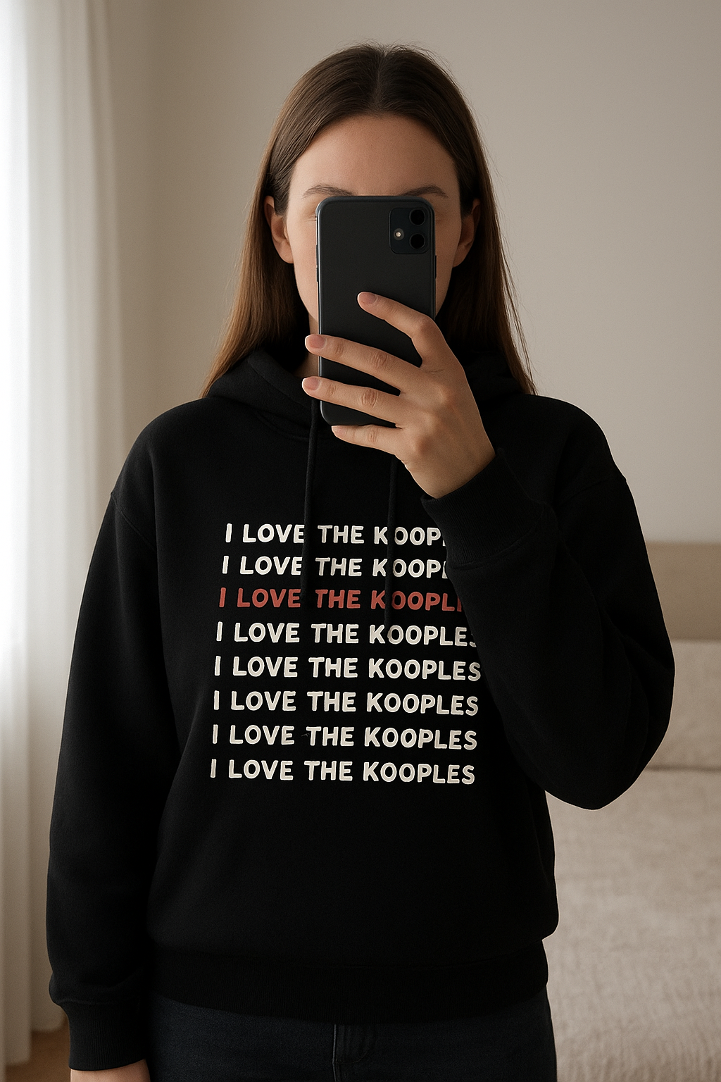 Sweat à capuche the kooples debout, face à la caméra, dans une chambre à la lumière douce, avec une lumière naturelle filtrant par la fenêtre.
