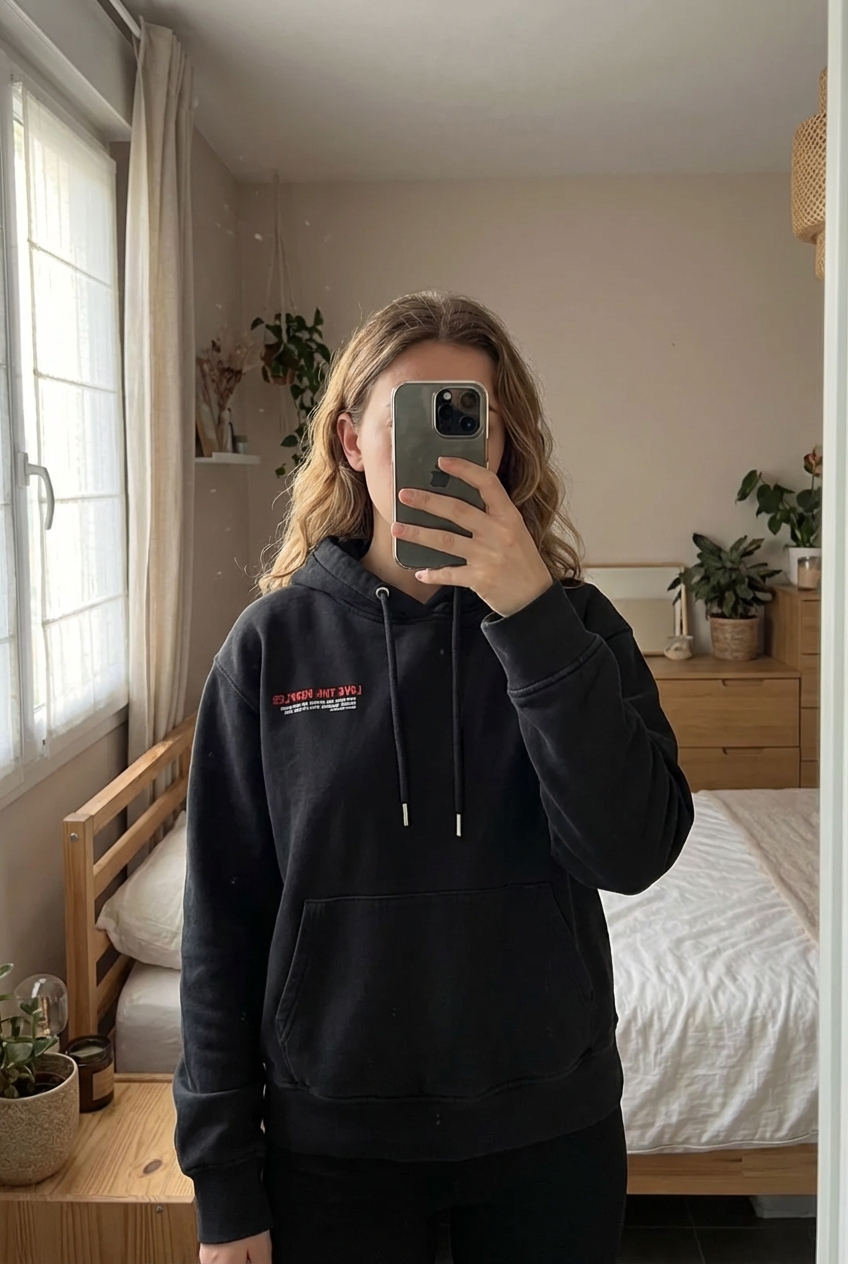 Sweat capuche The Kooples noir unisexe S debout, face à la caméra, dans une chambre à la lumière douce, avec une lumière naturelle filtrant par la fenêtre.
