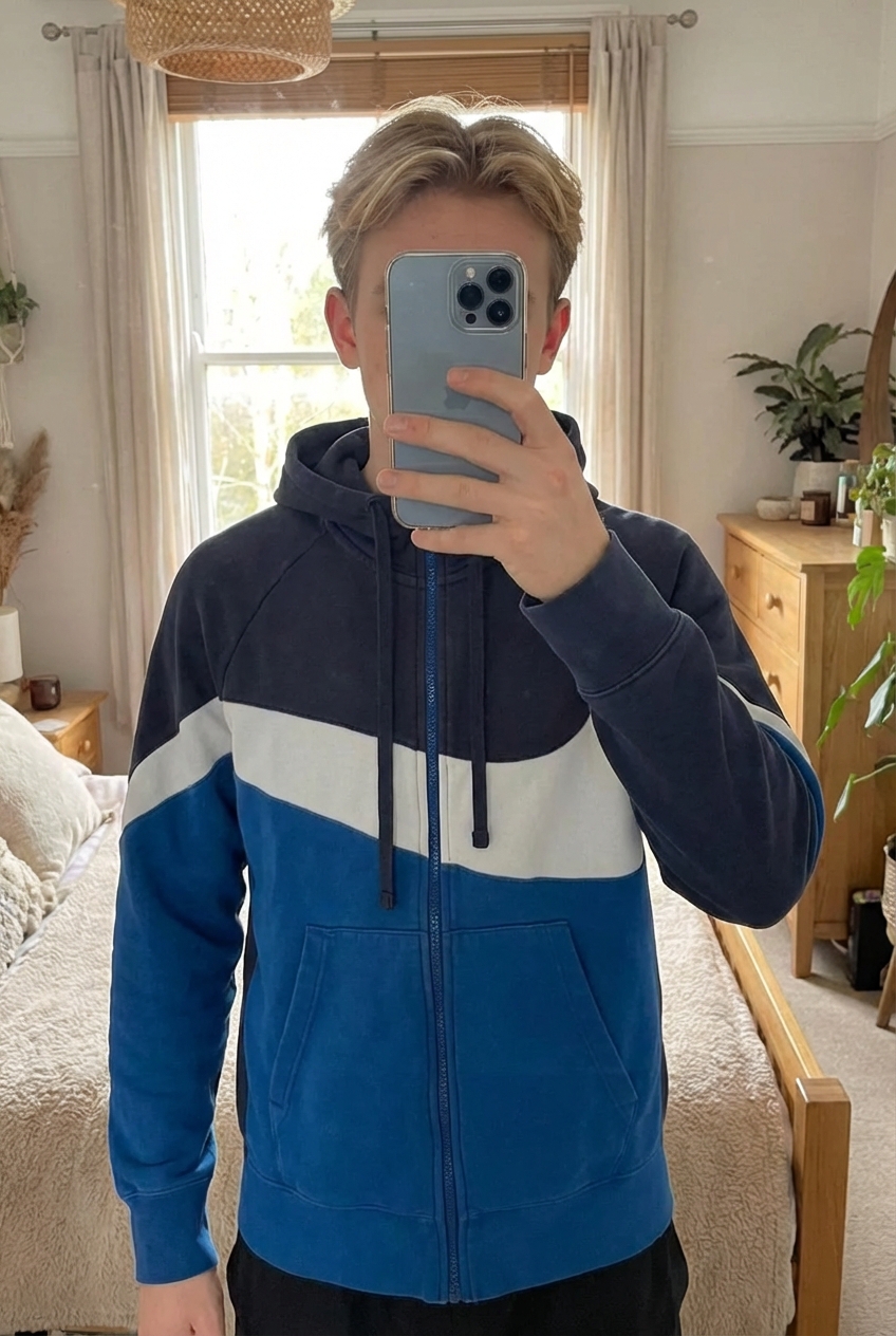 Sweat à capuche zippé Nike debout, face à la caméra, dans une chambre à la lumière douce, avec une lumière naturelle filtrant par la fenêtre.