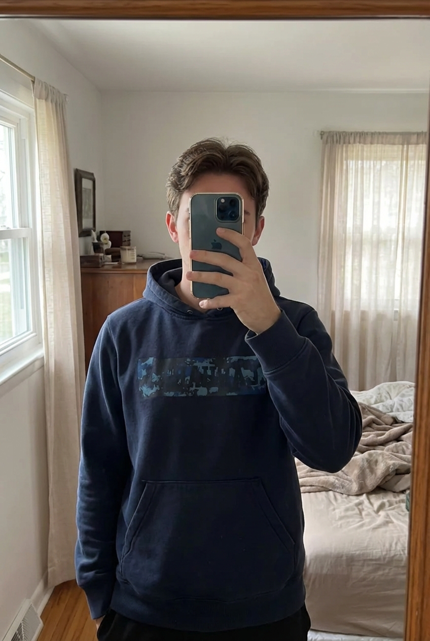 Sweat carhartt debout, face à la caméra, dans une chambre à la lumière douce, avec une lumière naturelle filtrant par la fenêtre.