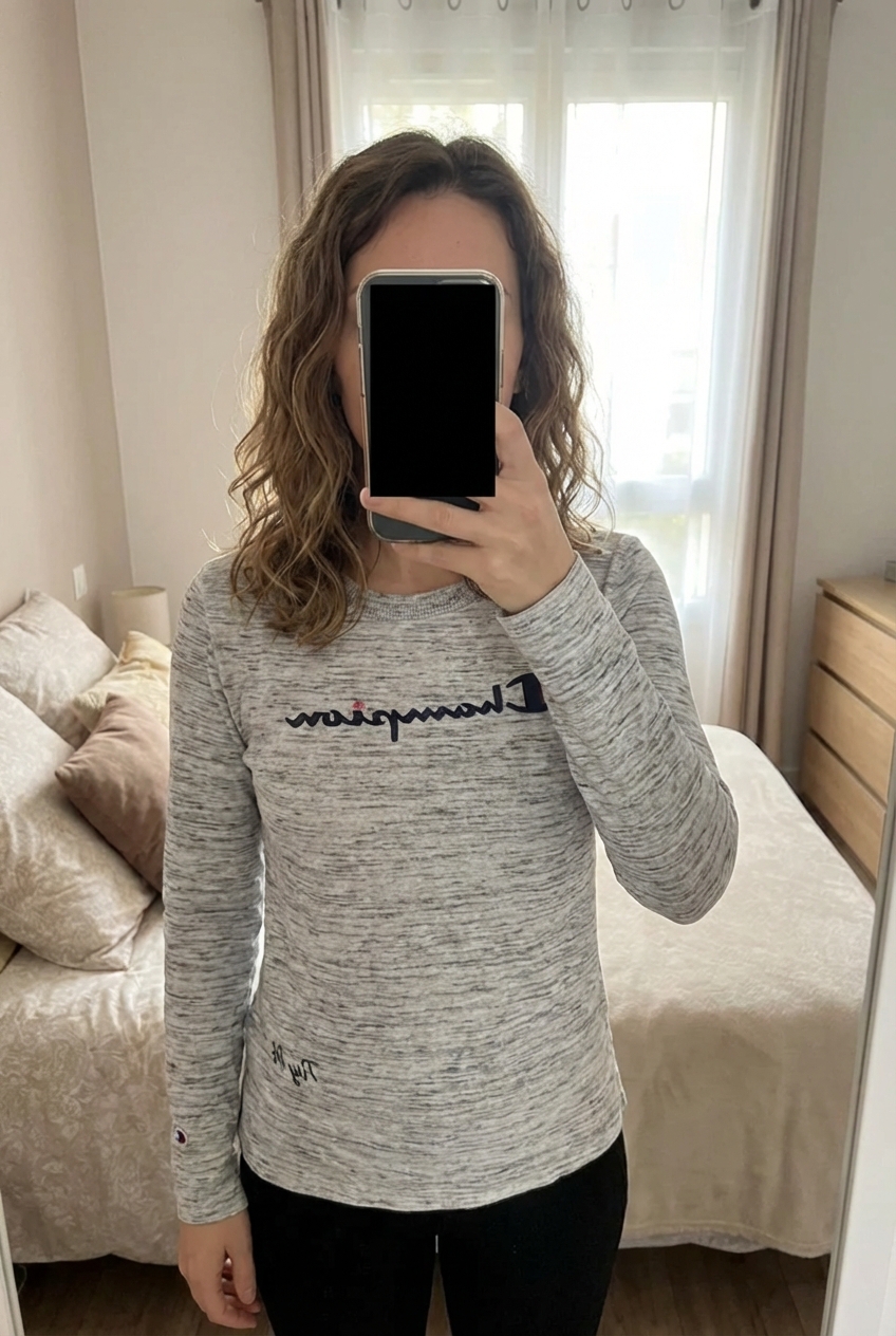Sweat gris Champion debout, face à la caméra, dans une chambre à la lumière douce, avec une lumière naturelle filtrant par la fenêtre.